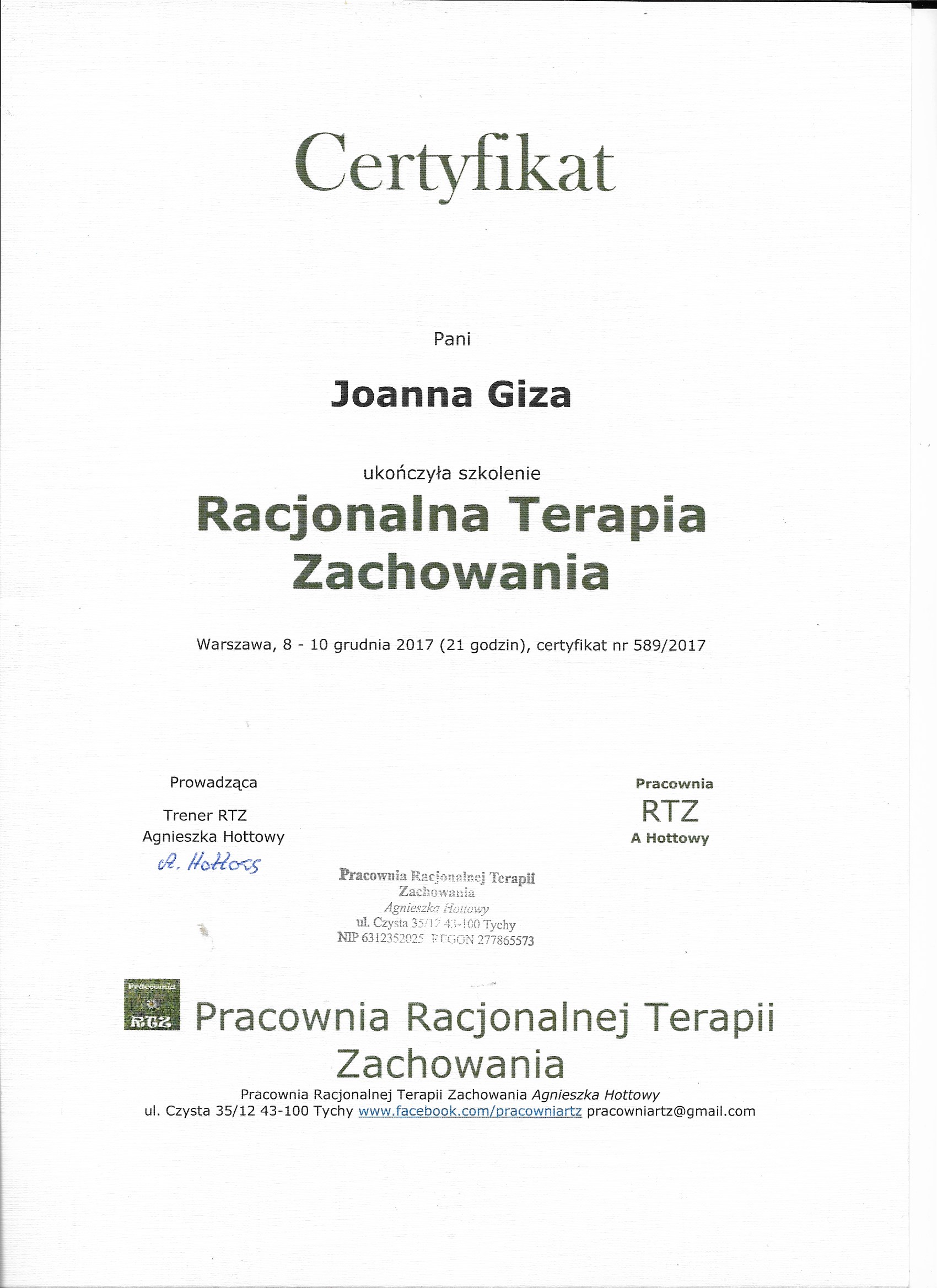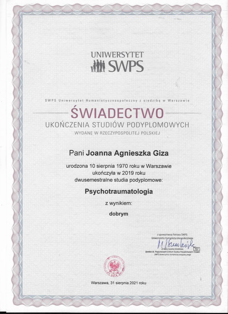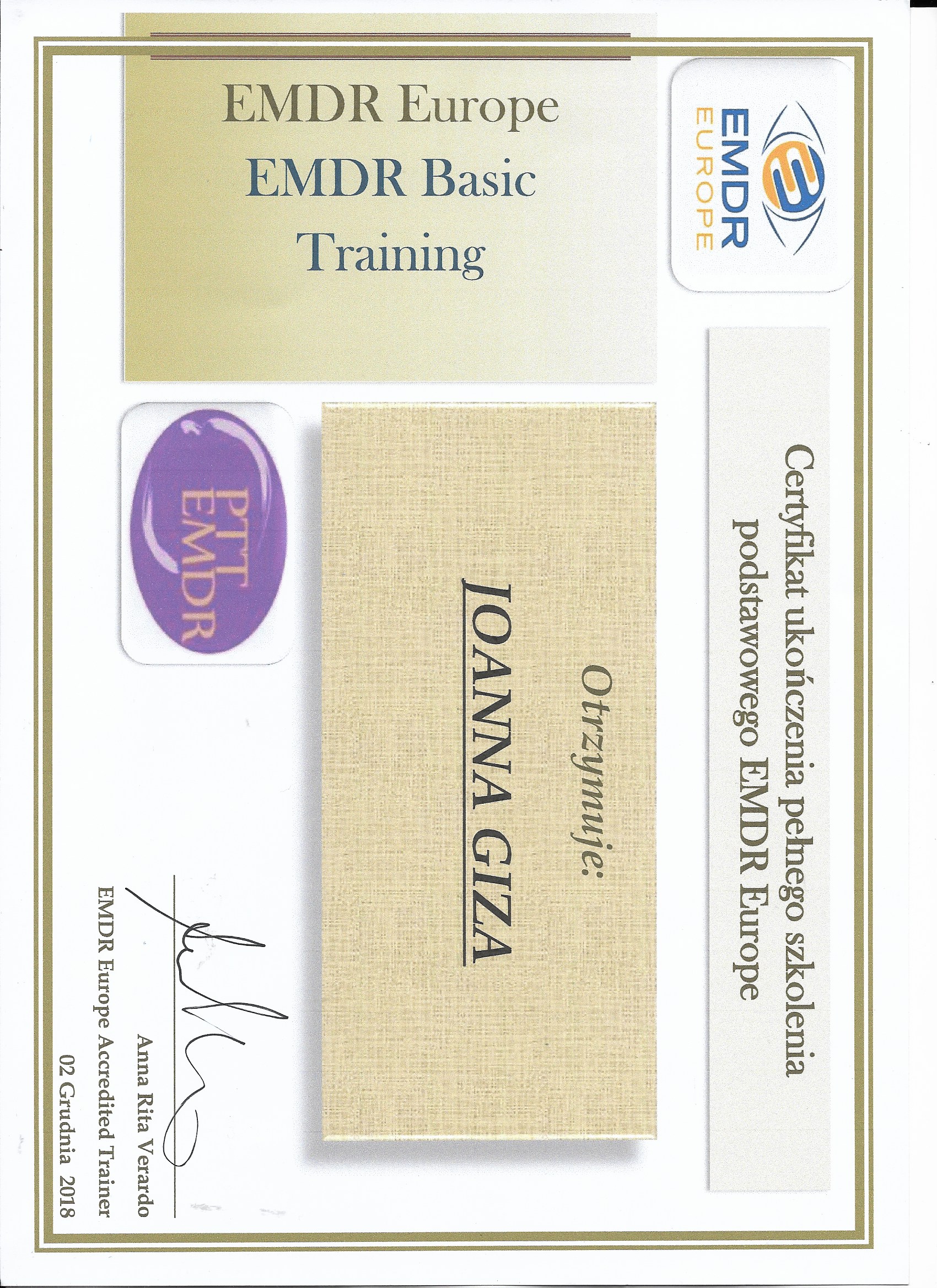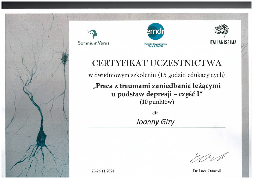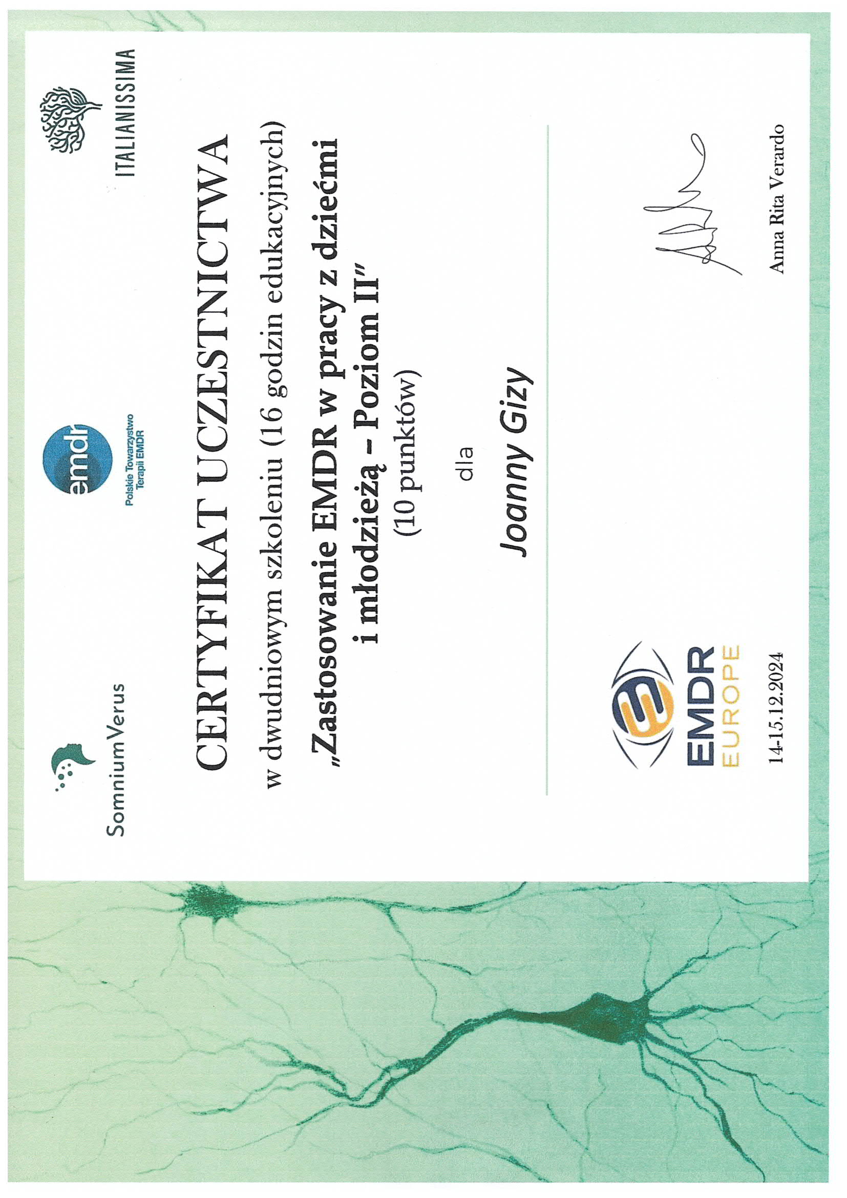 Certyfikat udziału w szkoleniu z Traumy prewerbalnej leczonej w ujęciu EMDR