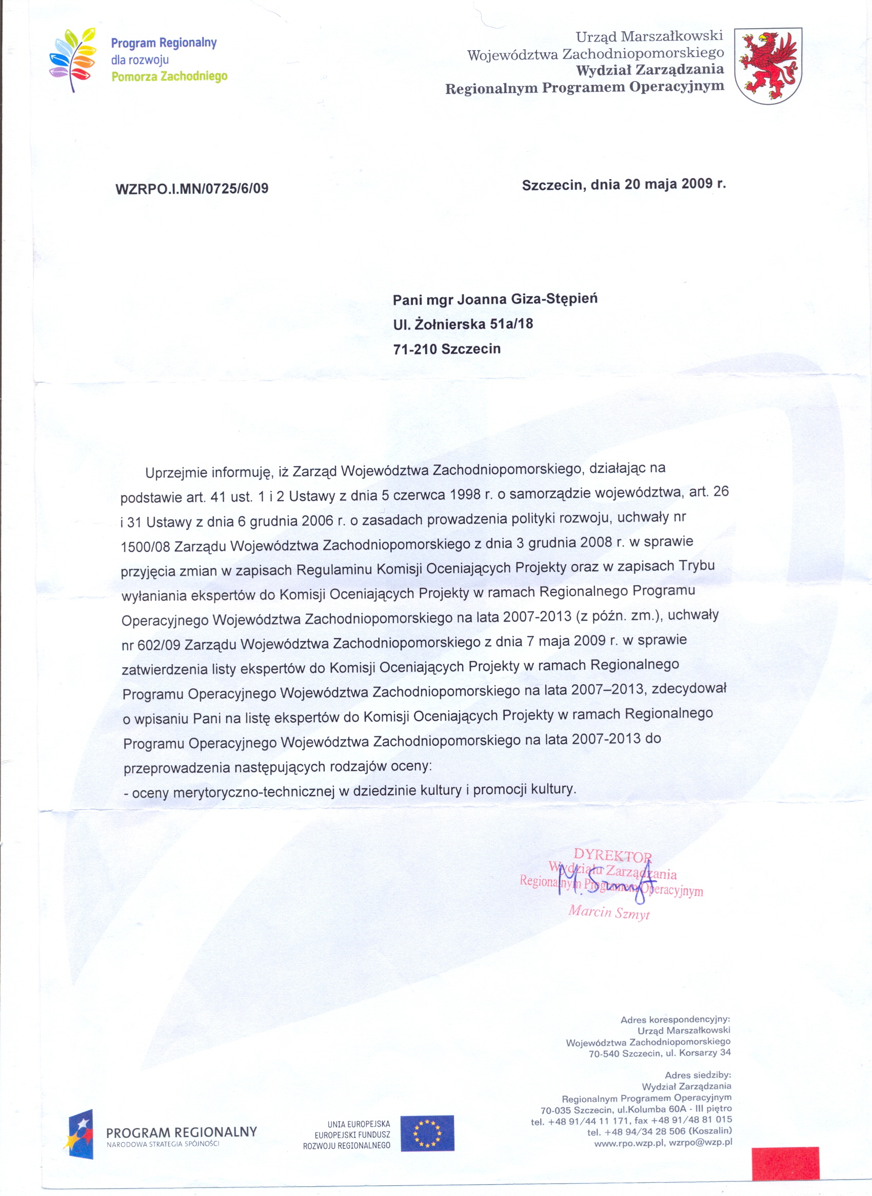 Tu wpis na listę ekspertów Komisji Oceniających Projekty Społecznokulturalne w ramach RPO w Zachodniopomorskiem na lata 2007-2013